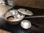 "The pan is among my earliest kitchen memories. It was in use in the early 50s but may date from 1940s? (My parents married non 1946) And it is still in regular use more than 60 years later. I believe it is made of tin alloy, something " tinkers" would repair as they journeyed around Ireland. The pan is itself well-travelled, having spent 20 years in the UK, and since I inherited it, has been to San Francisco, Vilnius and Helsinkiit is quite a clever device with 3 pans floating on a water container. It must have poached some 10.000 eggs so far ( 60 years at least x 3 eggs once a week at least x 52 weeks)...and still going strong!"